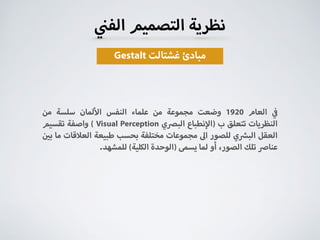 تتناول نظرية التصميم الجشتالتي مبادئ كيفية إدراك الصور والتجارب البصرية من خلال تنظيم العقل للمعلومات. تم تطوير هذه النظرية في العقد 1920 من قبل مجموعة من علماء النفس، وتركز على مفاهيم مثل الكلية والتبسيط، حيث يُعزى إلى العقل قدرته على تشكيل وحدات متكاملة من مشاهد متعددة. تشمل المبادئ الأساسية للنظرية التماثل، التقارب، والتناظر، وغيرها.