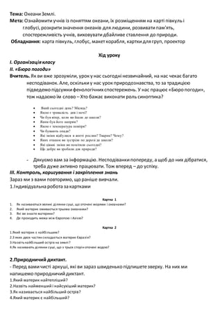 Мета: Ознайомитиучнівіз поняттям океани, їх розміщенням на карті півкуль і
