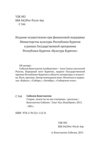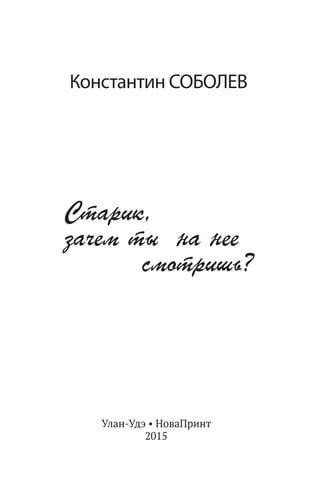 Документ представляет собой анализ творчества Константина Соболева, народного поэта Бурятии, который известен своими рассказами и 'крупинками', проникнутыми любовью к природе и жизни простых людей. Оценка его произведений подчеркивает их характерную связь с красотой родной земли и поднимает важные социальные темы, такие как пьянство и утрата идентичности. Книга 'Старик, зачем ты на нее смотришь?' обращается к широкому кругу читателей, вызывая у них эмоциональный отклик и размышления о жизни.