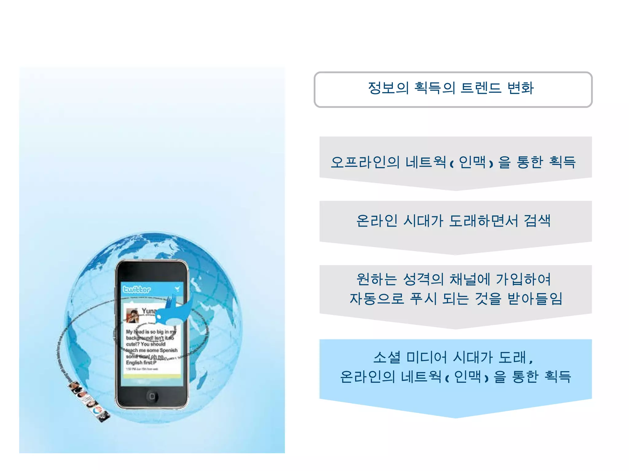 정보의 획득의 트렌드변화 오프라인의 네트웍 ( 인맥 ) 을 통한 획득 온라인 시대가 도래하면서 검색 원하는 성격의 채널에 가입하여 자동으로 푸시 되는 것을 받아들임 소셜 미디어 시대가 도래 , 온라인의 네트웍 ( 인맥 ) 을 통한 획득