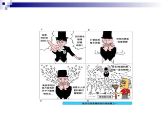 錯誤引導 (Misdiretion) 人們潛意識直覺會注意的層面 ◎ 會動的東西 --- 例如手勢、動作 ◎ 特定的身體部位—臉、眼睛、嘴巴 ◎ 發出聲音的東西—說話、音樂 ◎ 合乎邏輯的事物 - 故事、因果一致性 ◎ 迷人的事物—美人、帥哥、嬰兒、寵物