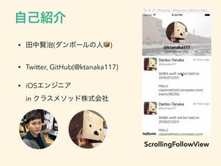 This document discusses a Yahoo Hack Day event on February 8, 2017 where the author worked on an iOS app called ScrollingFollowView. It lists the tools used including GitLab, Sketch, Carthage, Kingfisher, and Realm. It also mentions planning 24 hours of work over 3 days and sharing the author's GitHub and Twitter accounts.