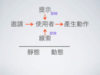 The document discusses different types of invitations in interfaces including call to action invitations in blogs, blank slate invitations, unfinished invitations, tour invitations, hover invitations, drag and drop invitations used in apps like Google Docs and Maps, and invitations that infer or move content. It focuses on using different visual and interaction cues to invite users to take actions.