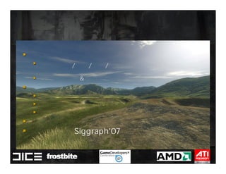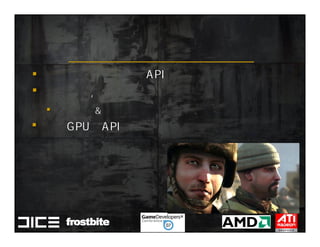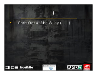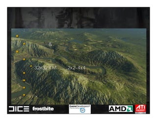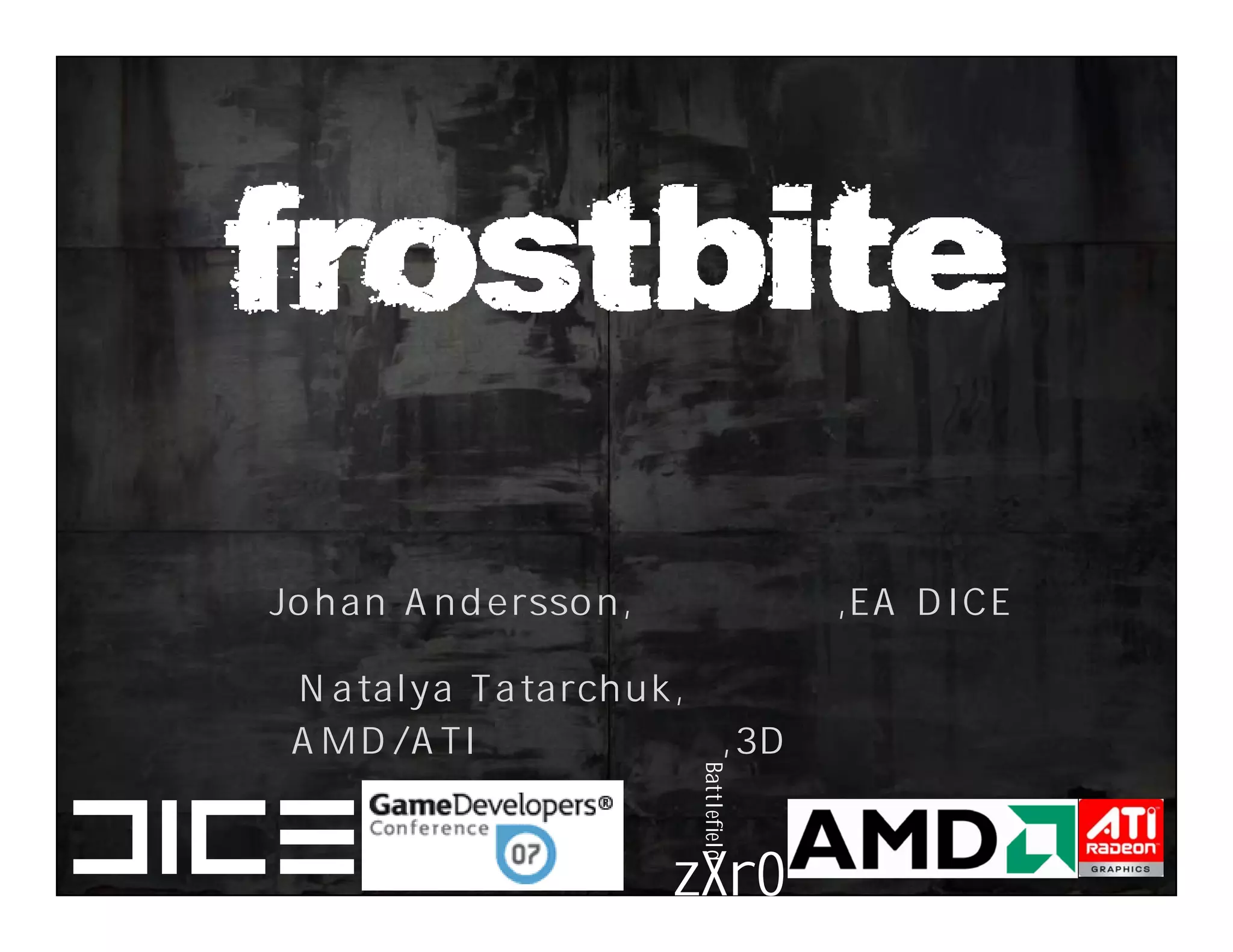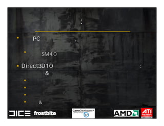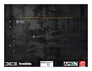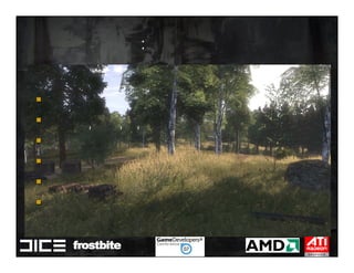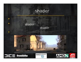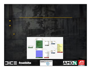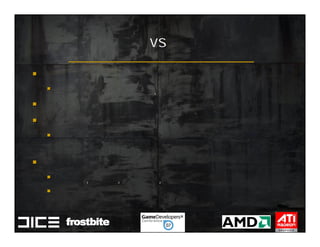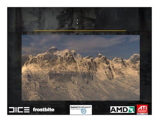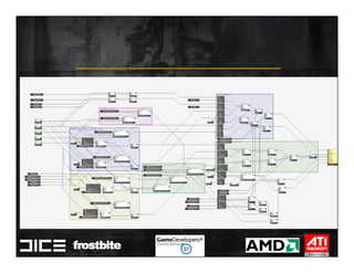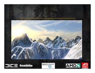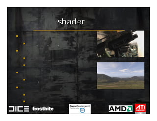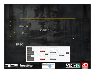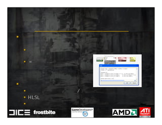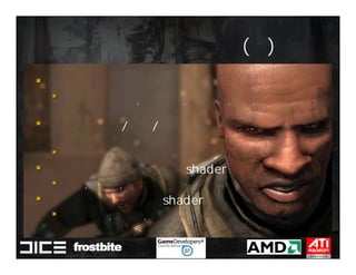 This document summarizes Johan Andersson's role as Rendering Architect at DICE and discusses rendering techniques for Battlefield games on Xbox 360 and PlayStation 3. It outlines the shading system used and how shaders are compiled to run on each platform's graphics API. It also references a GDC talk by Natalya Tatarchuk of AMD about noise techniques.