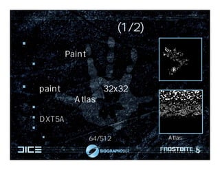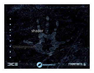 The document discusses techniques for generating undergrowth in game environments using cellular noise. It describes using a 3x64x64 texture atlas of alpha masks for undergrowth placed in 16x16m grid cells on the CPU and instantiated on the GPU. Normal maps are also generated to add detail to undergrowth. Care for anti-aliasing shaders is mentioned to improve the appearance of undergrowth edges.
