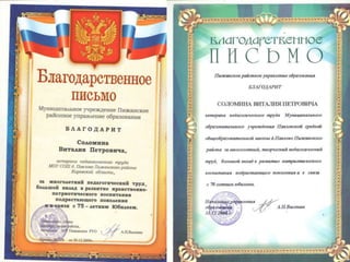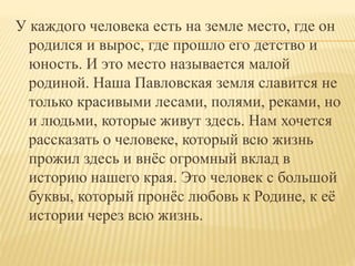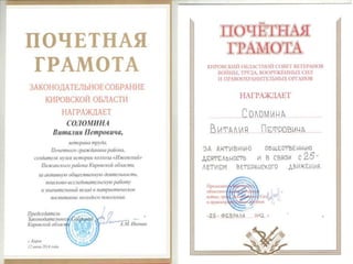 Документ описывает жизнь и достижения Виталия Петровича Соломина, российского историка-краеведа и педагога, который всю жизнь посвятил изучению и сохранению истории своей родины, д. Павлово и пижанского района. Он начал свою трудовую деятельность учителем и стал директором школы, создав при этом краеведческий музей и собрав значительные материалы о родном крае. На пенсии Виталий Петрович продолжает вести активную общественную жизнь и руководить музеем, передавая знания следующему поколению.