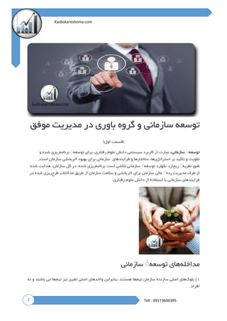 توسعه سازمانی: عبارت از کاربرد سیستمی دانش علوم رفتاری، برای توسعه ٔ برنامهریزی شده و ٔ تقویت و تأکید بر استراتژیها، ساختارها و فرایندهای سازمانی برای بهبود اثربخشی سازمان است. طبق نظریه ریچارد بکهارد توسعه ٔ سازمانی تلاشی است برنامهریزی شده، در کل سازمان، هدایت شده ٔ از طرف مدیریت رده عالی سازمان برای اثربخشی و سلامت سازمان از طریق مداخلات طرحریزی شده در ٔ فرایندهای سازمانی با استفاده از دانش علوم رفتاری.