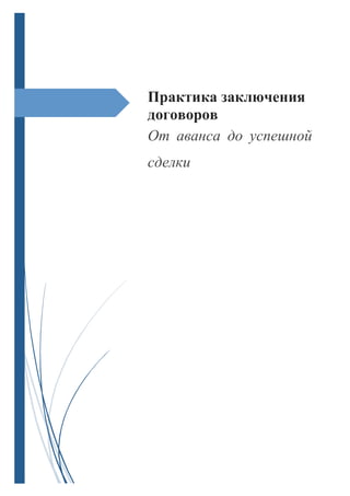 Документ представляет собой учебник, посвященный практике заключения договоров в сфере недвижимости, охватывающий ключевые этапы сделки от формирования доверительных отношений с клиентами до успешной передачи недвижимости. Он рассматривает основные виды договоров, такие как договор оказания услуг, договор поручения и агентский договор, подчеркивая важность четкого соблюдения правовых норм и процедур. Учебник также обращает внимание на необходимость прозрачных отношений между агентами и клиентами для избежания правовых споров и недоразумений.