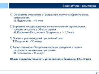 Документ описывает установочный семинар по программе 'система измерения и оценки для программ в области социального сиротства', целью которого является ознакомление участников с программой и получение обратной связи. Программа направлена на расширение возможностей некоммерческих организаций в оценке социальной эффективности их программ и включает разработку онлайн-сервиса для оценки социальных результатов. Ожидается, что участники программы получат поддержку экспертов, доступ к методическим материалам и возможность участия в обучающих мероприятиях.