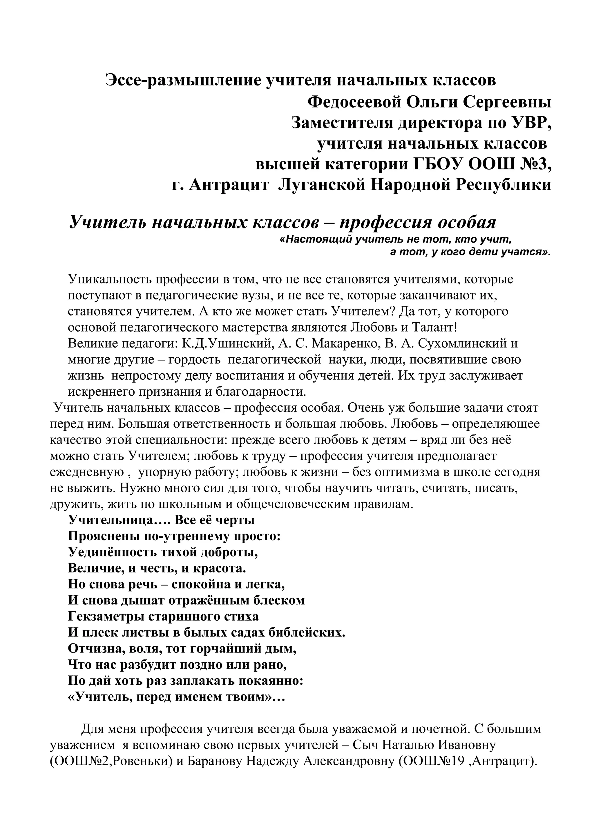 Эссе учителя начальных классов Ольги Сергеевны Федосеевой подчеркивает уникальность профессии, основанной на любви к детям, труду и жизни. Она акцентирует важность роли учителя в обучении и воспитании учеников, а также необходимости совершенствования образовательных методов в условиях современных изменений. Основное внимание уделяется развитию творческого потенциала и критического мышления у школьников через интерактивные технологии и активное участие родителей в образовательном процессе.