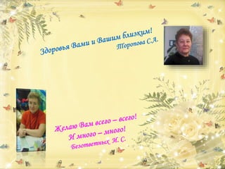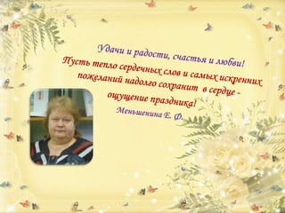 Поздравление Маргарите Васильевне с днем рождения 14 февраля 2017 года, в котором выражаются пожелания мудрости, здоровья, удачи и счастья. Коллектив центральной детской библиотеки им. П. П. Бажова присоединяется к поздравлениям. В тексте подчеркивается важность простого счастья и семейного уюта.