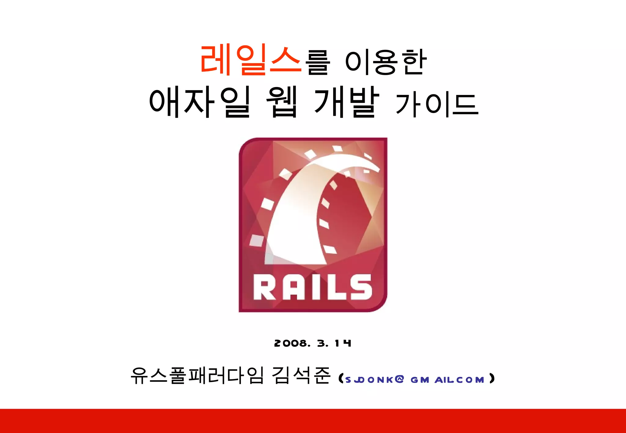 레일스 세상에 처음공개 (2004.7) David Heinemeier Hansson Basecamp 프로젝트 (37signals) 가 모태 레일스 1.0 (2005.12) Scaffold 코드 자동 생성 등 레일스 1.1 (2006.3) RJS, 통합테스팅 등 레일스 1.2 (2007.1) 리소스 (resource) 개념 도입 레일스 2.0 (2007.12) MVC 웹 프레임워크에서 REST 플랫폼으로 ( http://weblog.rubyonrails.org/2007/12/7/rails-2-0-it-s-done )