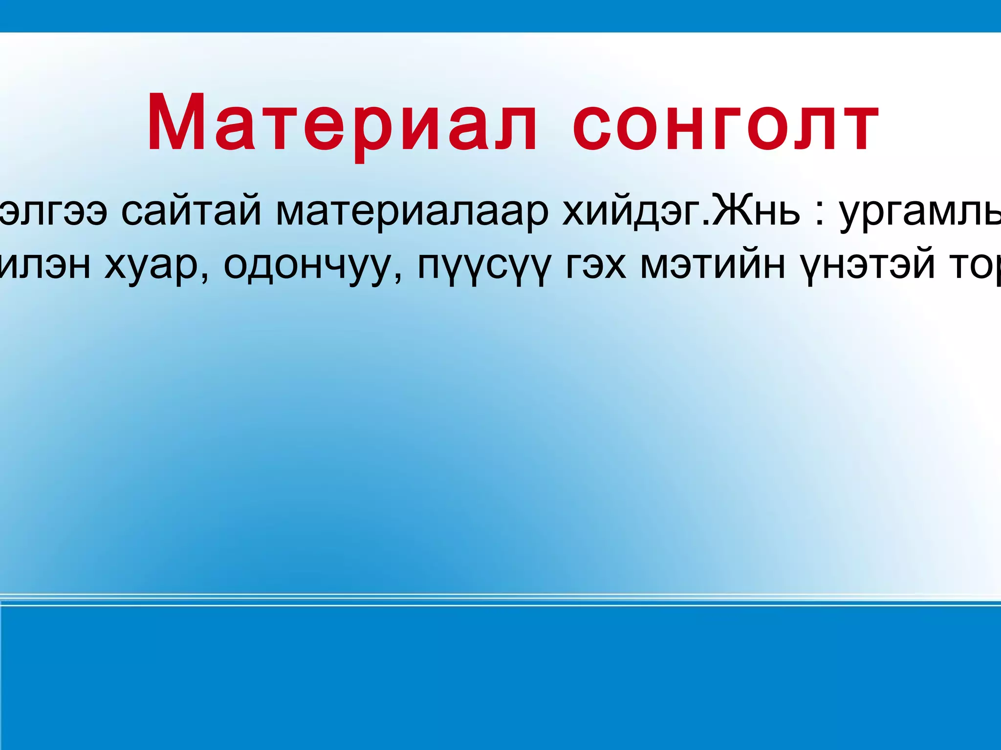 Материал сонголт “ Хүнийг хувцсаар нь угтаж , ухаанаар нь үддэг ” гэсэн үг байдаг . Иймээс сайхан хувцаслахыг хүн бүр эрхэмлэвэл зохино . - 19.