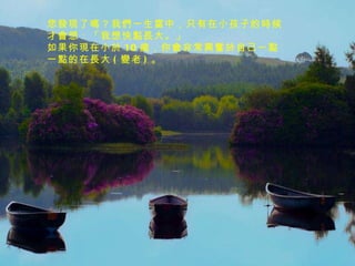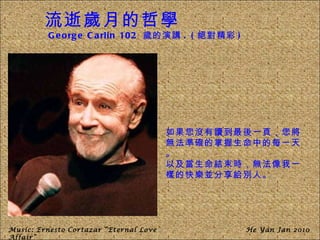这是乔治·卡林关于时间流逝和人生哲学的演讲,强调了人们对于年龄的感知变化和生命的珍贵。他建议通过抛弃不必要的数字、维持快乐的人际关系、持续学习等方式保持年轻和积极的心态。与此同时,欣赏生活中的简单快乐和珍惜与亲友的关系也是活得充实的重要因素。