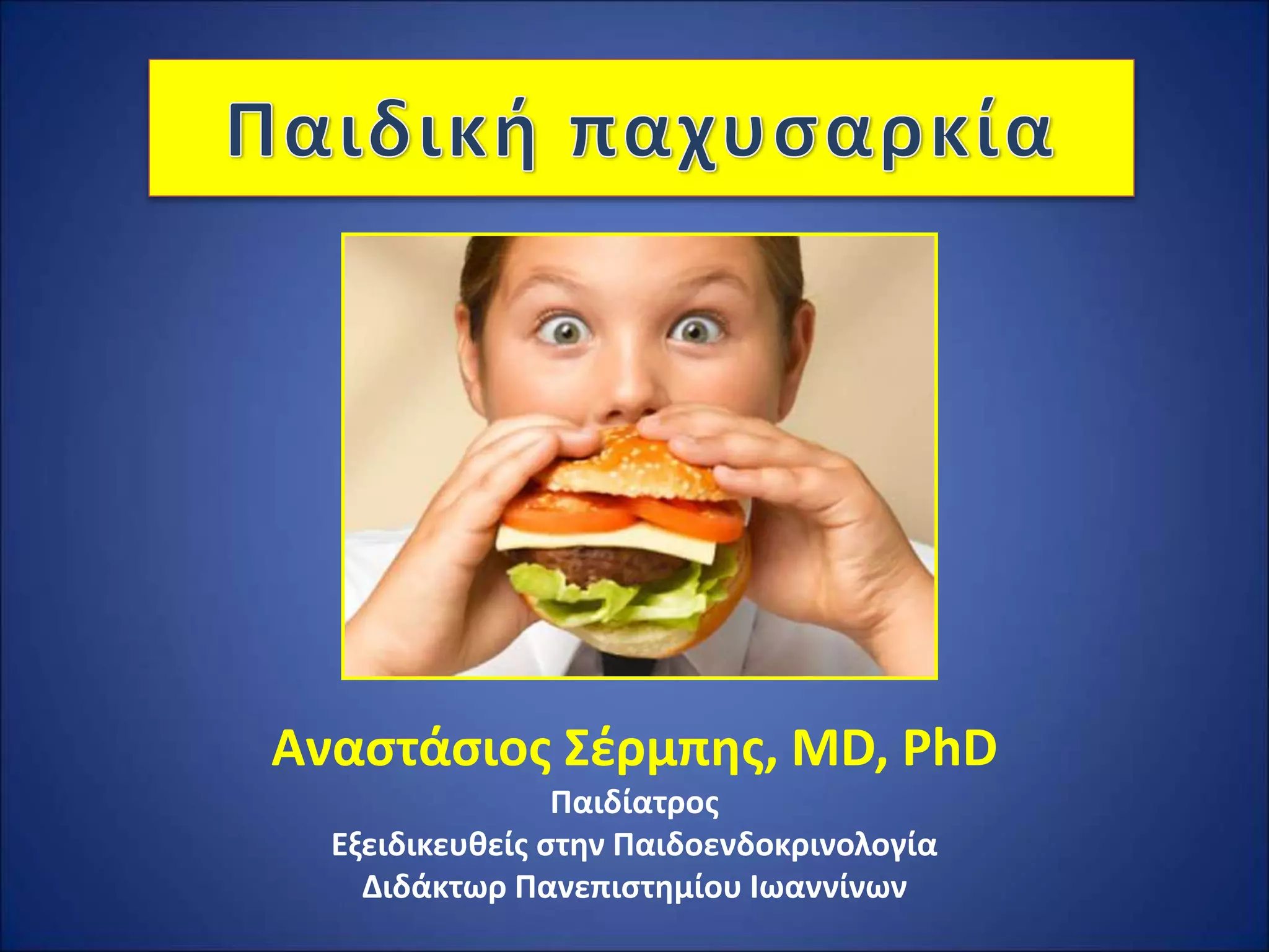Η συγκεκριμένη ομιλία έχει φτιαχτεί για γονείς και παιδιά κι αναφέρεται στο σύγχρονο πρόβλημα του Δυτικού Κόσμου που είναι το αυξημένο σωματικό βάρος στην παιδική κι εφηβική ηλικία. Καθώς η χώρα μας έχει πολύ υψηλά ποσοστά υπέρβαρου και παχυσαρκίας στις ηλικίες αυτές, είναι πολύ σημαντικό για τους γονείς να γνωρίζουν πότε ένα παιδί είναι υπέρβαρο ή παχύσαρκο, ποιοι παράγοντες οδηγούν στο πρόβλημα και τι μπορούν να κάνουν για να το προλάβουν ή και να το αντιμετωπίσουν.