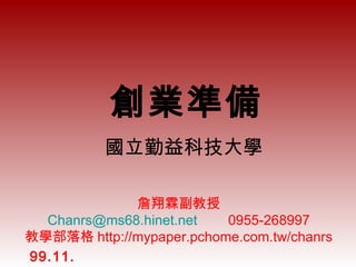 该文档提供了关于创业准备的重要信息,涉及创业者所需的特质、能力、环境分析、市场趋势及创业规划等。它强调成功创业需要随时评估自身及外部环境,并提出了创业的基本条件与资源盘点。最后,文档列出了一些未来热门创业行业和创业成功的关键要素。