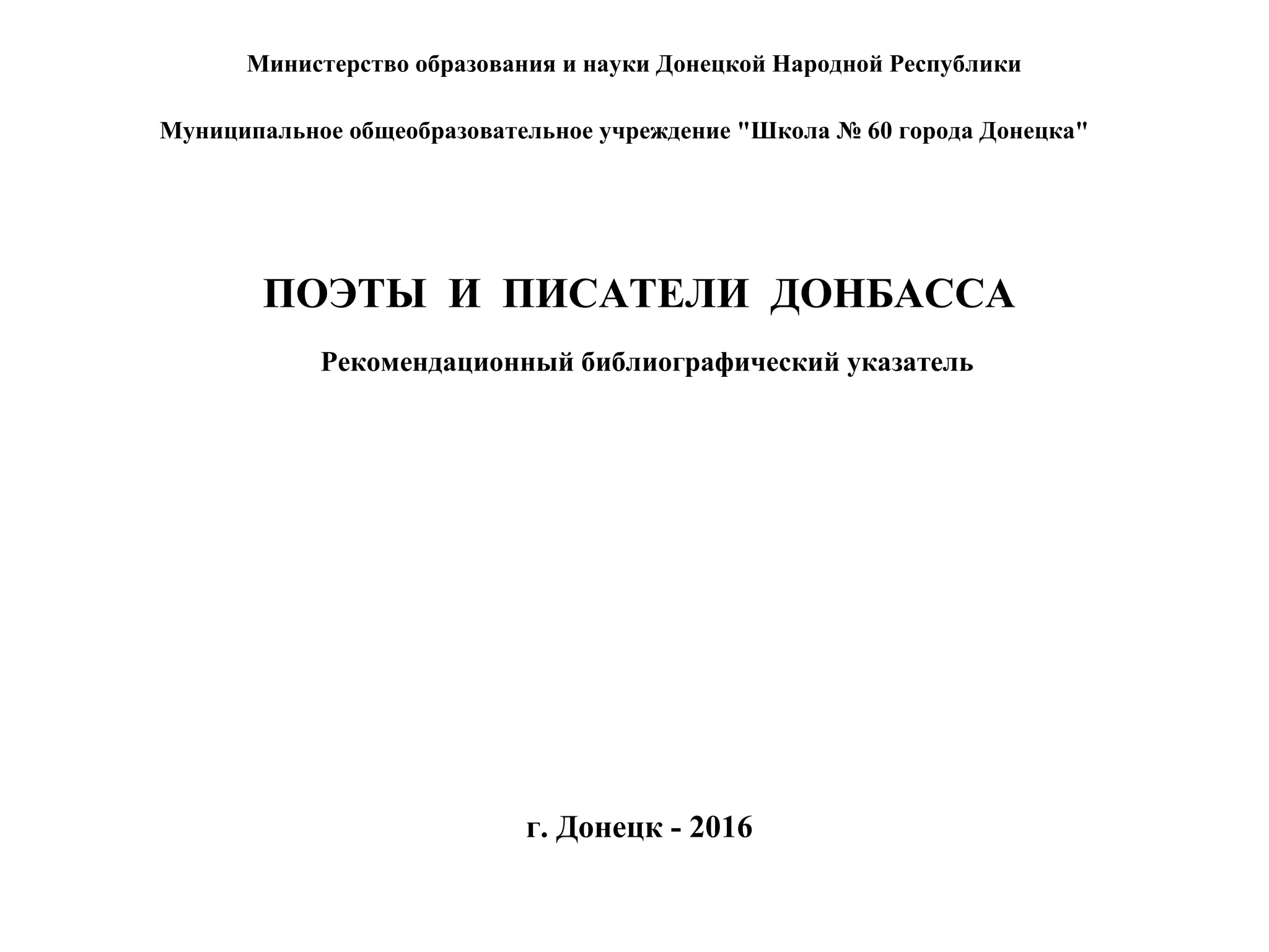 Документ представляет собой библиографический указатель, содержащий список рекомендованной литературы о поэтах и писателях Донбасса, составленный для изучения истории и литературы региона. В указателе представлены произведения выдающихся авторов, а также краткие аннотации и тематические разделы о культуре и литературной жизни Донбасса. Издание адресовано учителям, библиотекарям и всем интересующимся литературным наследием Донецкой области.