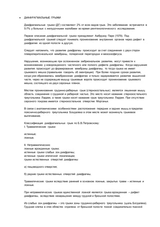 Диафрагмальные грыжи составляют 2% от всех видов грыж и могут быть врожденными или приобретенными, с классификацией на травматические и нетравматические. Наиболее распространены грыжи пищеводного отверстия диафрагмы, которые могут вызывать серьезные клинические симптомы и осложнения, такие как язвы и перфорации. Лечение включает консервативную терапию и хирургическое вмешательство при необходимости.
