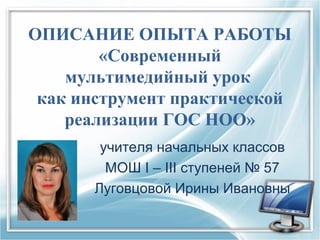 Документ описывает опыт работы учителя начальных классов Ирины Ивановны Луговцовой, фокусируясь на использовании мультимедийных технологий для повышения качества обучения. Основные задачи включают усиление интенсивности уроков, повышение мотивации учащихся и мониторинг их достижений. Также освещается важность общения с коллегами, учениками и родителями, а также необходимость документации и аттестации учебных материалов.