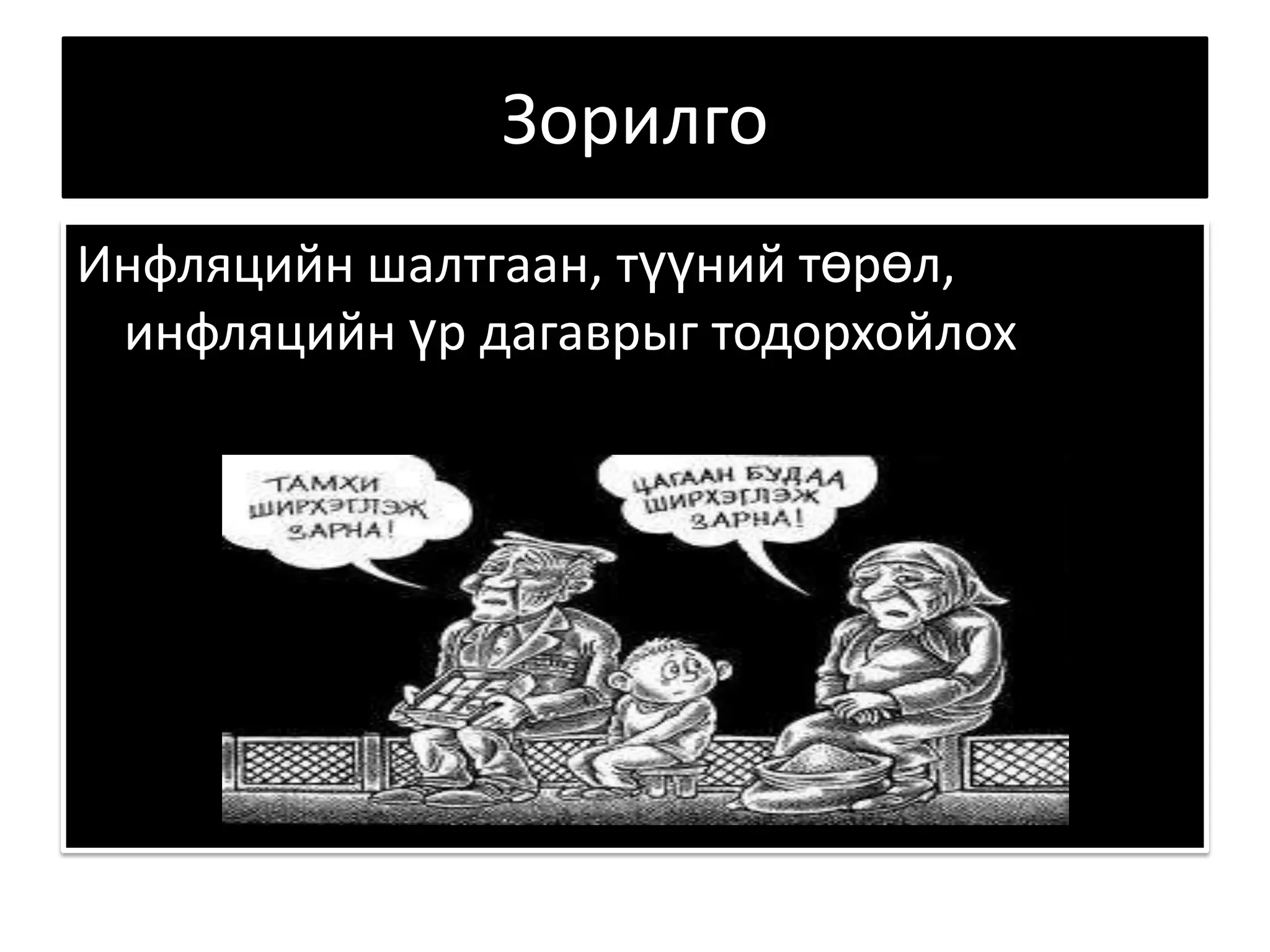 Зорилт Инфляцийн үүсэхшалтгаан нөхцлийг танин мэдэх, Инфляцийн төрөл, түүнийг ялгах Инфляцийн үр дагаврыг тодорхойлж, дүн шинжилгээ хийх, Инфляциас гарах арга замыг тодорхойлох - 4.