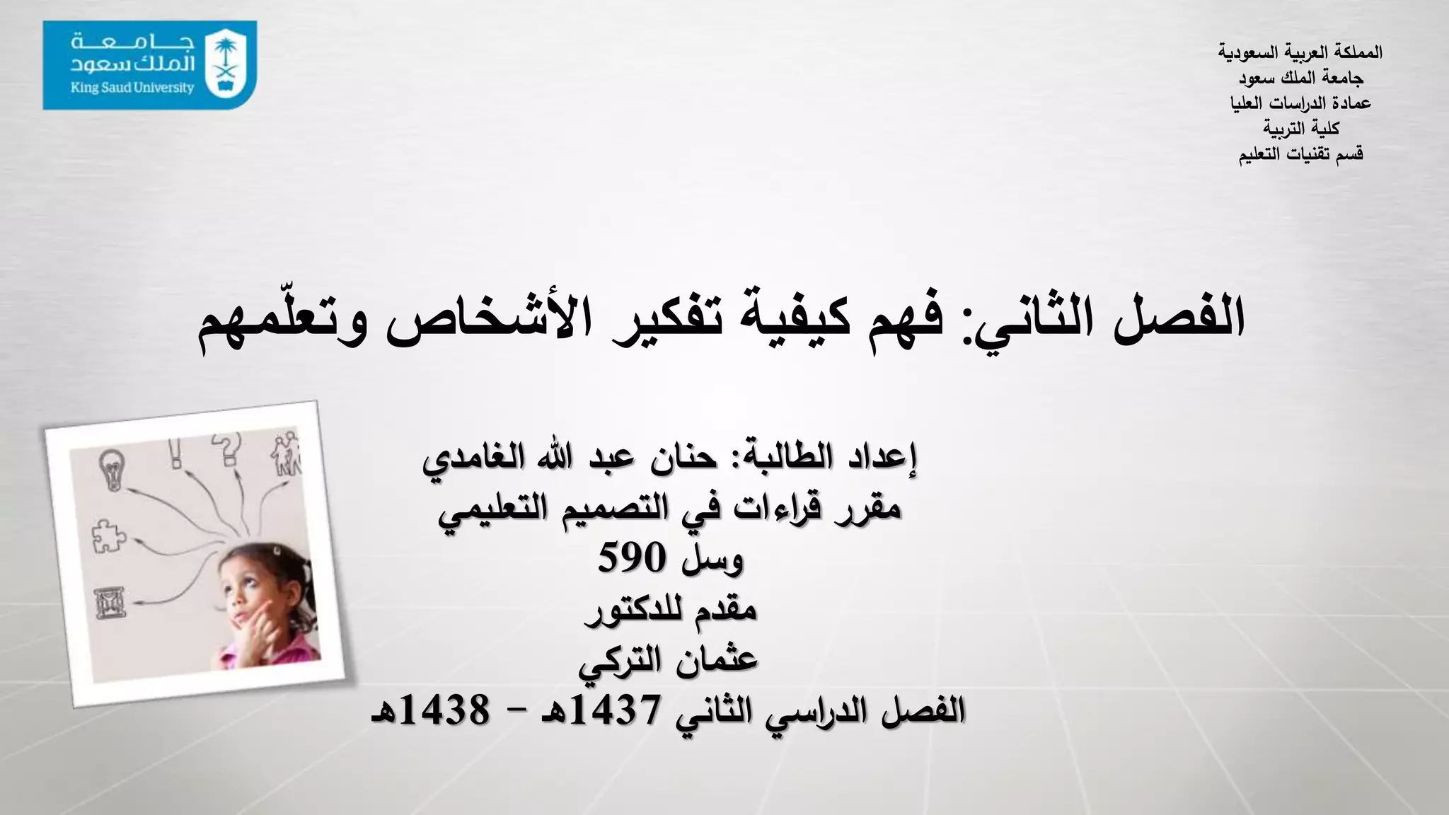 يتناول هذا المستند موضوع التفكير التعليمي وكيفية تصميمه، مع التركيز على فهم كيفية تفكير الأفراد ومعالجة المعلومات. يستعرض أنواع المعرفة وعلاقتها بالتفكير، بالإضافة إلى العمليات المعرفية والقدرات اللازمة للتعلم. كما يتطرق إلى أهمية التفكير في التصميم التعليمي وتأثيره على استراتيجيات التعليم.