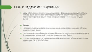 Документ анализирует роль вкладов физических лиц в формировании ресурсной базы коммерческого банка на примере ОАО ВУЗ-банк. Он охватывает классификацию вкладов, теоретические аспекты депозитной политики и текущее состояние рынка вкладов в России, а также предлагает рекомендации по улучшению привлечения вкладов. Основное внимание уделяется структуре депозитов, их характеристикам и стратегиям развития банковских услуг для увеличения привлечения депозитов от населения.