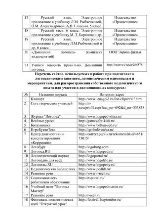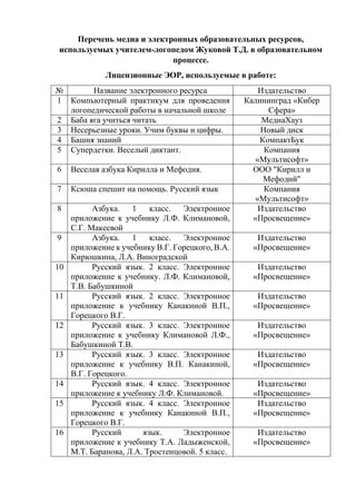 Документ содержит перечень медиа и электронных образовательных ресурсов, используемых учителем-логопедом Т. Д. Жуковой в учебном процессе, включая лицензионные ресурсы и сайты для подготовки к логопедическим занятиям. Представлены также ссылки на персональные сайты с электронным портфолио. Вся информация структурирована и включает названия материалов и соответствующие издательства.