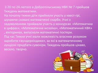 тиждень математики 1. 2. З 20 по 24 лютого в Добропільському НВК № 7 пройшов