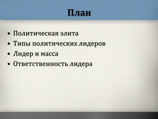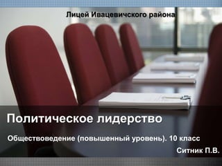 Документ освещает концепцию политического лидерства, определяя политическую элиту как группу, обладающую значительной властью и влиянием в обществе. Описаны различные типы политических лидеров, включая традиционного, харизматического и рационально-легального, а также их обязанности и ответственность. Приведены стили лидерства, такие как авторитарный, демократический и попустительский, которые влияют на эффективность руководства.