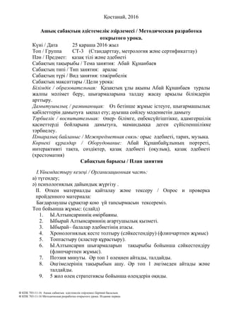 Ашық сабақтыңәдістемелік әзірлемесі / Методическая разработка