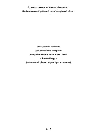 Методичний посібник складено для керівників гуртків декоративно-ужиткового мистецтва і всіх тих, хто хоче навчити дітей бісерному мистецтву.