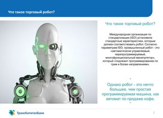 Документ рассматривает трансформацию обслуживания клиентов с использованием торговых роботов и самоинкассации, подчеркивая преимущества автоматизации. Самоинкассация позволяет организациям безопасно и быстро зачислять наличные средства через устройства самообслуживания, предлагая экономию времени и снижение рисков. Также упоминается концепция электронного кассира, который призван облегчить процесс безналичных расчетов и автоматизировать финансовые потоки.