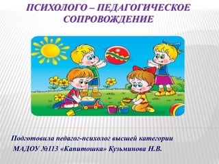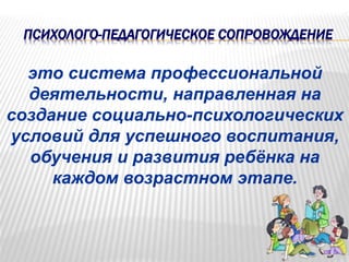 Документ описывает психолого-педагогическое сопровождение в детском саду, инициированное педагогом-психологом, направленное на создание благоприятных условий для воспитания и обучения детей. Основные задачи включают развитие индивидуальных особенностей детей, создание комфортного климата в учреждении и оказание своевременной психологической помощи детям и родителям. Выделены разнообразные методы работы, как с детьми, так и с родителями, а также мероприятия для педагогов, что способствует укреплению взаимодействия между семьей и дошкольным учреждением.