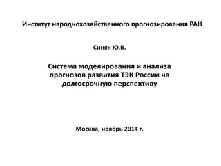 Документ описывает систему моделирования и анализа прогнозов развития топливно-энергетического комплекса (ТЭК) России до 2060 года, включая динамическую линейную модель долгосрочного прогнозирования. Основные цели системы включают разработку прогнозных топливно-энергетических балансов, оценку влияния новых технологий, а также анализ спроса и предложения на энергоносители. Модель учитывает категории топлива и технологий, а также различные сценарии развития макрорегионов.