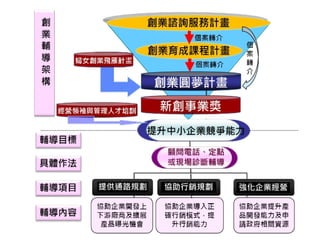 创业挑战赛 - 活动举办、奖项表扬 • 22 创业育成学院 - 课程培训、网站平台 • 23 智能财产价值创造计划 - 咨询辅导、网站平台 • 24 加强投资策略性服务业实施方案 - 咨询辅导、创投 / 投资协助 • 25 协助传统产业技术开发计划( CITD ) - 补助 • 26 服务业创新研发计划( SIIR ) - 补助 • 27 中小企业创新发展项目贷款 - 咨询辅导、贷款 • 28 补助办理创业楷模选拔暨表扬系列活动计划 - 活动举办、补助、 网站平台、奖项表扬 • 29 IDEAS Show 网络创意展 - 活动举办、奖项表扬 • 30 创业咨询服务计划 - 咨询辅导、活动举办、网站平台、展销通路