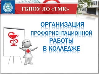Документ описывает организацию профориентационной работы в колледже, включая методы взаимодействия с абитуриентами, студентами и школами. Приведены формы и проекты профориентационной деятельности, а также методы подготовки студентов к профессиональной деятельности через практику и сотрудничество с медицинскими учреждениями. Цель работы заключается в помощи выпускникам школ в осознанном выборе медицинской профессии и развитии их профессиональных навыков.