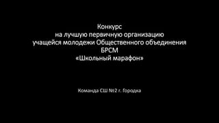 Документ описывает конкурс на лучшую первичную организацию учащейся молодежи в рамках общественного объединения БРСМ. Участвуют команды из разных школ, в частности, команда СШ №2 города Городка. Основной акцент сделан на мероприятие 'Школьный марафон'.