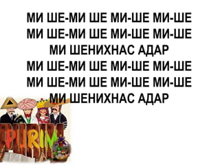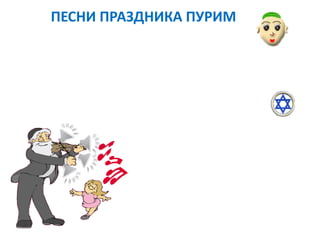 Документ содержит тексты песен, связанных с праздником Пурим, а также некоторые молитвы и поэтические строки, отражающие радость и духовность этого праздника. В песнях упоминаются традиции, связанные с Пурим, и выражается благодарность Богу. Темы надежды, радости и духовного единства также пронизывают текст.