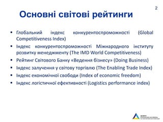 #4 Рейтинги України у глобальному індексі конкурентоспроможності (138-144 країни) та індексі конкурентоспроможності Міжнародного інституту розвитку менеджменту (60-61 країна) в України за досліджувані роки не мали зростаючого тренду, оскільки вони у значній мірі включають загальноекономічні чинники - інституції, інфраструктуру, макроекономіку, освіту да охорону здоров’я, ефективність товарного ринку та ринку праці, технологічний розвиток та інноваційність тощо.