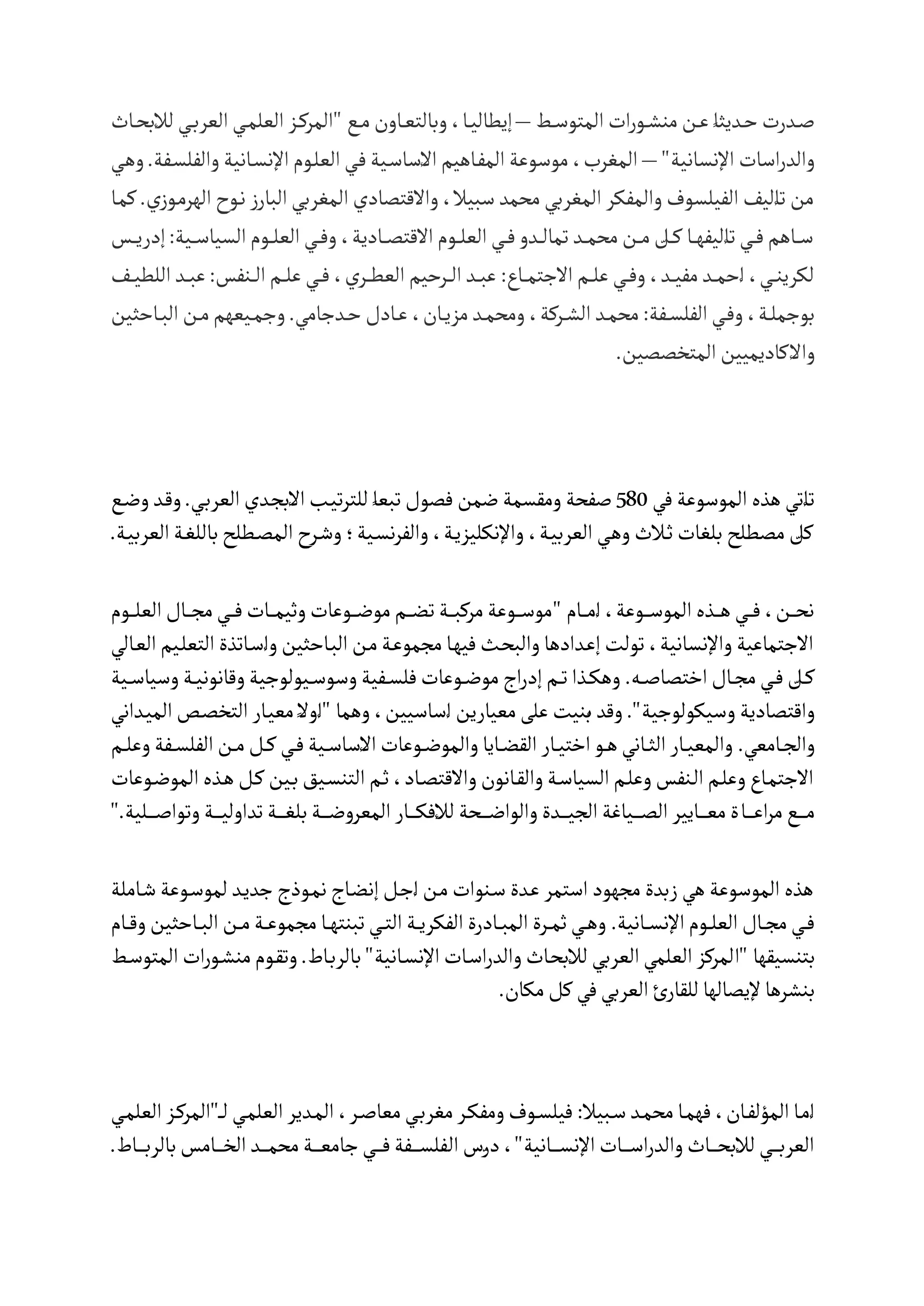 صدرت حديثاً عن منشورات المتوسط – إيطاليا، وبالتعاون مع "المركز العلمي العربي للأبحاث والدراسات الإنسانية" – المغرب، موسوعة المفاهيم الأساسية في العلوم الإنسانية والفلسفة. وهي من تأليف الفيلسوف والمفكر المغربي محمد سبيلا، والاقتصادي المغربي البارز نوح الهرموزي. كما ساهم في تأليفها كلّ من محمد تمالدو في العلوم الاقتصادية، وفي العلوم السياسية: إدريس لكريني، أحمد مفيد، وفي علم الاجتماع: عبد الرحيم العطري، في علم النفس: عبد اللطيف بوجملة، وفي الفلسفة: محمد الشركة، ومحمد مزيان، عادل حدجامي. وجميعهم من الباحثين والأكاديميين المتخصصين.