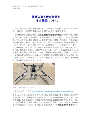 亮治 興味のある研究分野と その展望について 私は、現在 3 年生のため研究室に属しておらず、卒業論文に着手しておりませ ん。これより、私が現在興味のある研究についてここに記します。 私の興味のある研究分野は、水素吸蔵媒体の金属の小型化についてです。なぜ ならば、私は長崎大学が主催の『夢の懸け橋プロジェクト』という学生が取り組 むプロジェクトで、技術を駆使し、撮影者や周りの環境・人々にとって安全安心 かつ使いやすい既存には無いドローンを、「ドローンを用いた空の産業革命」と いうプロジェクト名の下で製作中です。人に無害なドローンを製作している中 で、現在のドローンで使われているリチウムイオンバッテリーに着目しました。 これは、最大で約 20 分しか飛行できなく、もしバッテリーが切れたら落下し、人 と衝突する可能性もあります。しかし、長時間の飛行が可能なら突然にバッテリ ーが切れる事は防げます。私は、この短時間の飛行時間の問題をどのようにすれ ば解決できるのかを書籍やウェブページを見て探しました。その結果、水素燃料 が一番有効ではないかと思いました。 Figure 1 水素燃料を用いたドローン (参考ウェブページ 1)http://japanese.engadget.com/2015/05/20/4-hycopter/ しかし、これにも欠点があります。それは、水素を貯蓄するために高圧な水素ガ スを貯蓄するための耐高圧ボンベをドローンに取り付ける必要があります。この 技術では、高圧に水素ガスを供給するための高価な機器が別に必要となり、そし て、部品が劣化した場合に破裂して、ドローンも故障し、近くにいた人に怪我を 負わす可能性もあります。この策として考えたのが、水素吸蔵媒体の金属です。