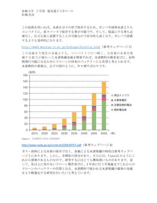 亮治 この技術を用いれば、水素を分子の形で保存するため、ボンベや液体水素よりも コンパクトに、省スペースで保存する事が可能です。そして、低温にする事も必 要なく、圧力も低く設置することが可能なので安全性も高くなり、ボンベで設置 するよりも効率的になります。 http://www3.muroran-it.ac.jp/hydrogen/hstalloy.html(参考ウェブページ 2) この金属を今現在の金属よりも、コンパクトでかつ軽く、大容量の水素を吸 蔵する能力が備わった水素吸蔵金属を開発すれば、水素燃料自動車並びに、長時 間飛行可能になるためにドローンの将来のバッテリーにも有望と考えられます。 水素燃料の需要は、以下の図のように、年々増すばかりです。 Figure 2 水素燃料の将来の需要推移 http://www.nedo.go.jp/content/100639757.pdf(参考ウェブページ 3) ガス・液体による水素の保存でなく、金属による水素吸蔵の特性は参考ウェブペ ージ 2 にあります。しかし、未開拓の部分があり、さらには、Figure2 のようにこ れから需要のあるものなので、研究するにはとても興味深いものがあります。従 って、私は人に害のないドローン製作並びに、4 年次に行う卒業論文でこれからの ドローンのバッテリーの代替となる、水素燃料で使われる水素吸蔵の媒体の金属 をより軽量化する研究を行いたいと考えています。