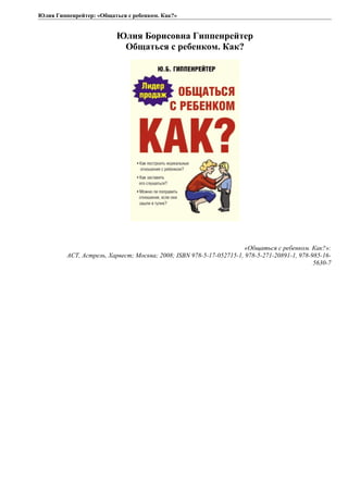Книга Юлии Гиппенрейтер 'Общаться с ребенком. Как?' посвящена важности общения между взрослыми и детьми для их психического и физического развития. Автор подчеркивает, что нарушения в отношениях в семье могут негативно сказаться на детях, и предлагает гуманный подход к воспитанию, основанный на понимании и уважении. В издании представлены практические советы и уроки, призванные помочь родителям улучшить свои навыки общения с детьми и создать благоприятную атмосферу в семье.