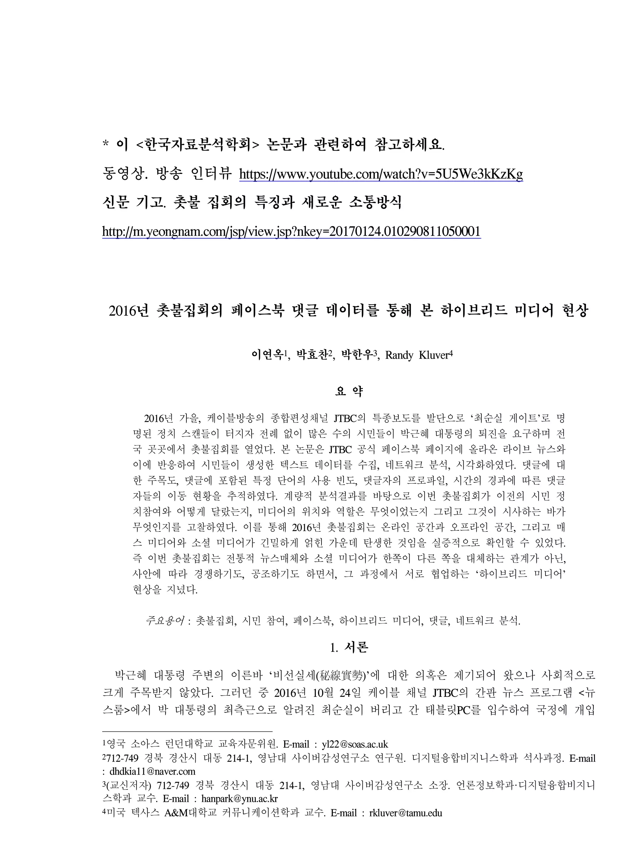 이연옥1, 박효찬2, 박한우3, Randy Kluver4