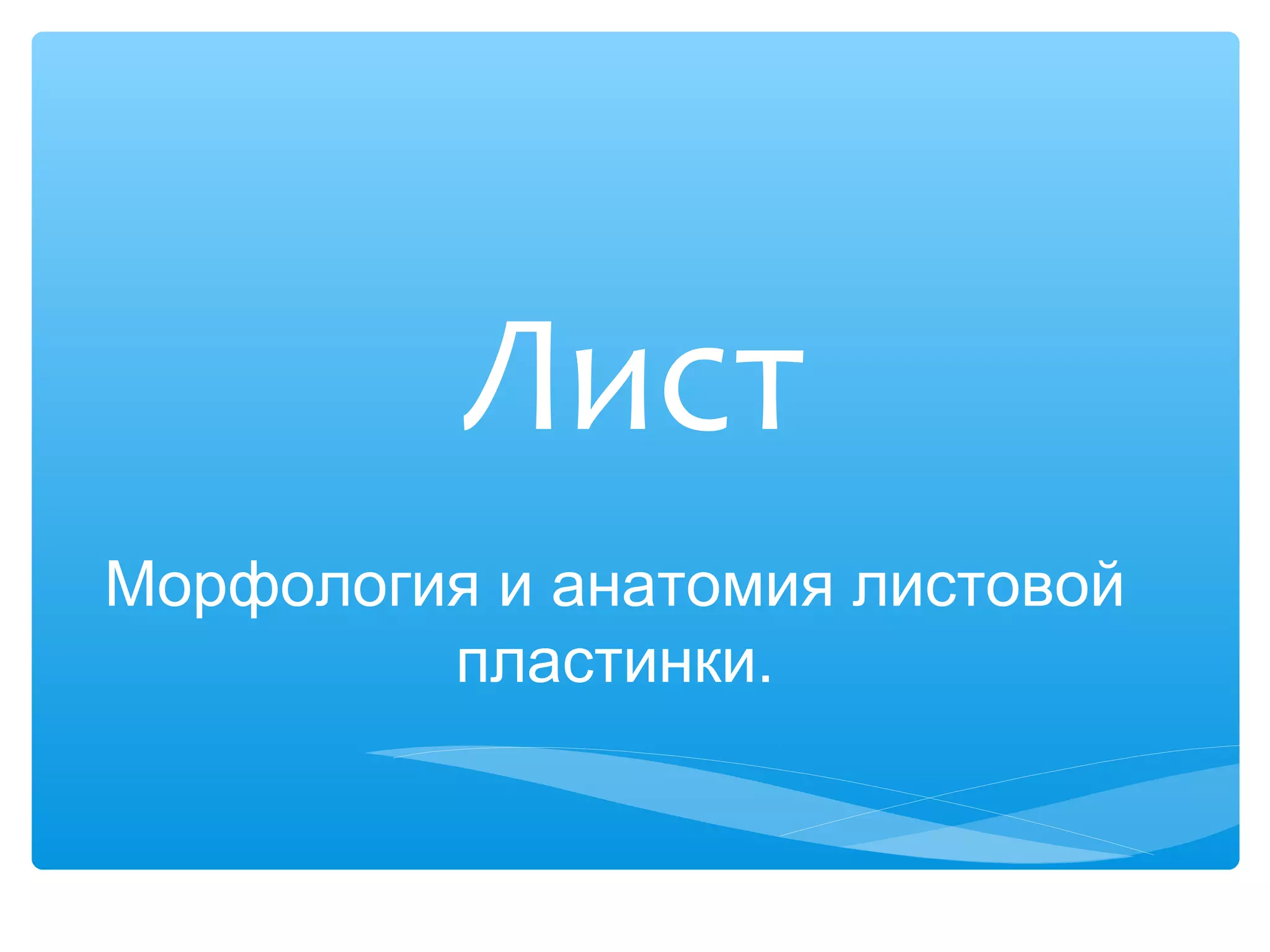 Документ описывает морфологию и анатомию листа, его функции, такие как фотосинтез, дыхание и транспирация, а также разнообразие форм листьев и их строение. Рассматриваются типы жилкования, края и формы верхушек листовых пластинок, а также метаморфозы, которые могут происходить у листьев. Учебный материал акцентирует внимание на развитии листа, его анатомическом строении и функциональной роли в жизни растений.