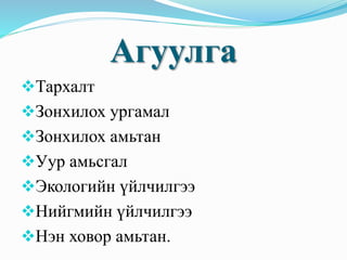 амьсгал Экологийн үйлчилгээ Нийгмийн үйлчилгээ Нэн ховор амьтан.