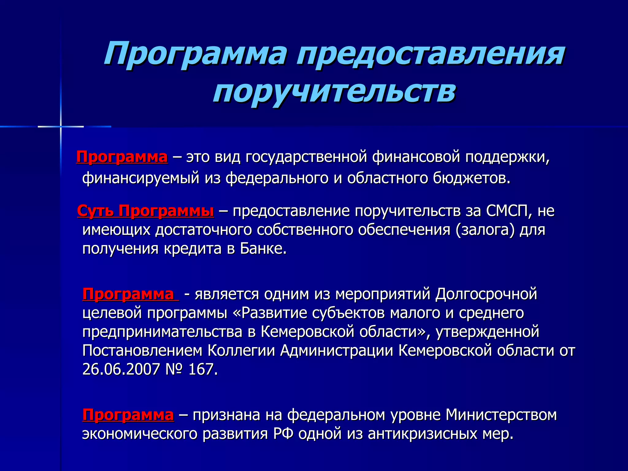 Программа предоставления поручительств Кемеровской области направлена на поддержку субъектов малого и среднего предпринимательства, обеспечивая доступ к кредитным ресурсам банков для предприятий без достаточного залога. Финансируемая из федерального и областного бюджетов, программа позволяет выдавать поручительства на сумму до 16,9 млн. рублей, покрывая до 70% от суммы кредита, что способствует развитию бизнес-среды в регионе. С 2009 по 2010 год было выдано 331 поручительство на сумму 413,6 млн. рублей, что привлекло дополнительные кредитные средства в размере 865,6 млн. рублей.