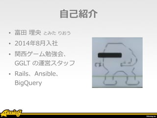 とみた りおう • 2014年8⽉⼊社 • 関⻄ゲーム勉強会、 GGLT の運営スタッフ • Rails、Ansible、 BigQuery