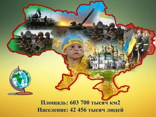 Документ содержит информацию о территории и населении Украины, включая ее реки, исторические памятники и культурное наследие, такие как Львов и Буковель. Он также упоминает украинское казачество и ключевые исторические события, связанные с военными походами, архитектурой и памятниками. Разнообразные категории вопросов относятся к культурным и историческим аспектам Украины, включая литературу, географические объекты и гербы.