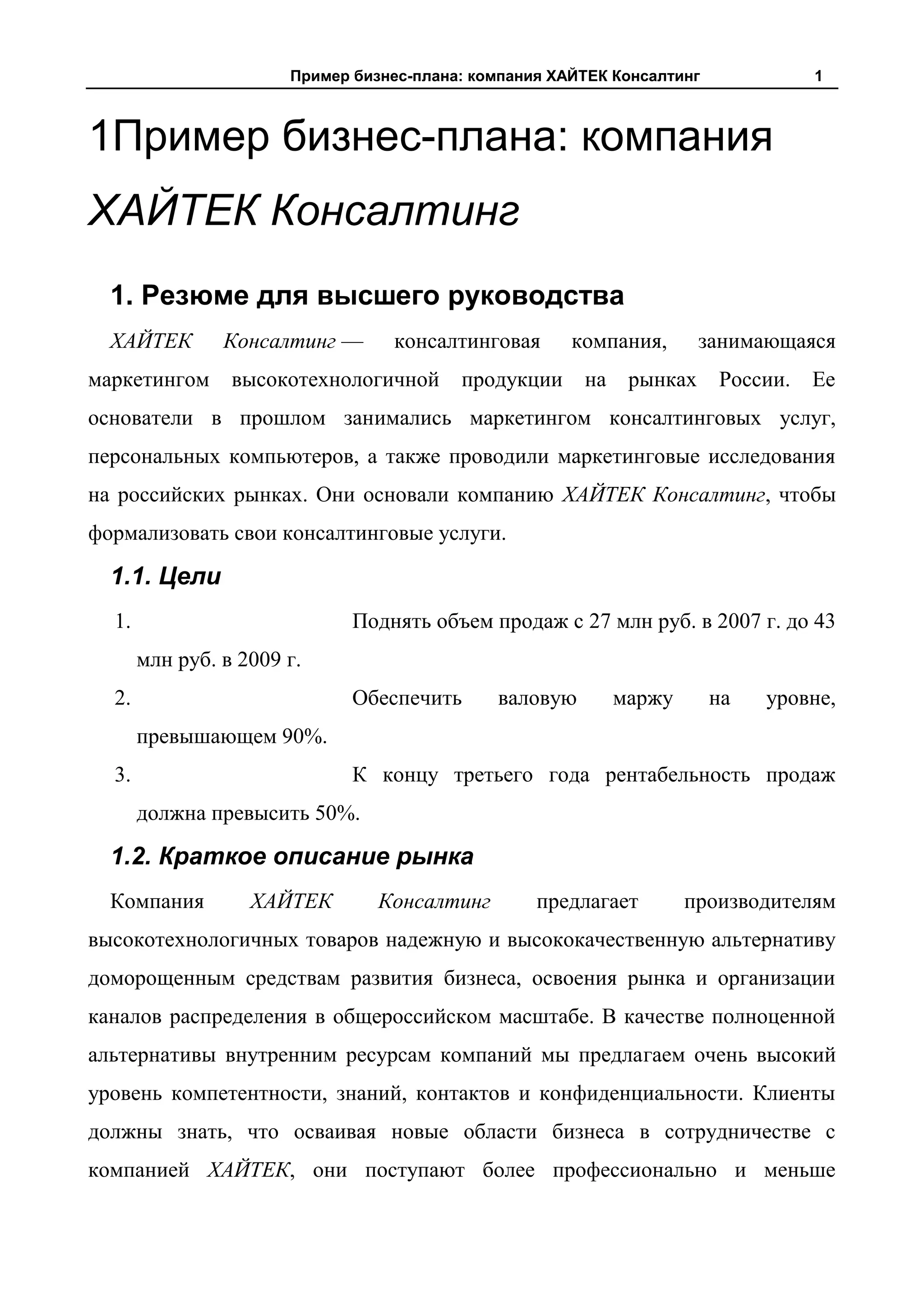 Документ представляет бизнес-план консалтинговой компании 'Хайтек Консалтинг', ориентированной на маркетинг высокотехнологичной продукции в России. Основные цели компании включают увеличение продаж до 43 млн руб. к 2009 году и достижение рентабельности продаж свыше 50%. Компания предлагает квалифицированные услуги по организации дистрибуции и маркетинговым исследованиям, акцентируя внимание на высоком уровне надежности и конфиденциальности для своих клиентов.